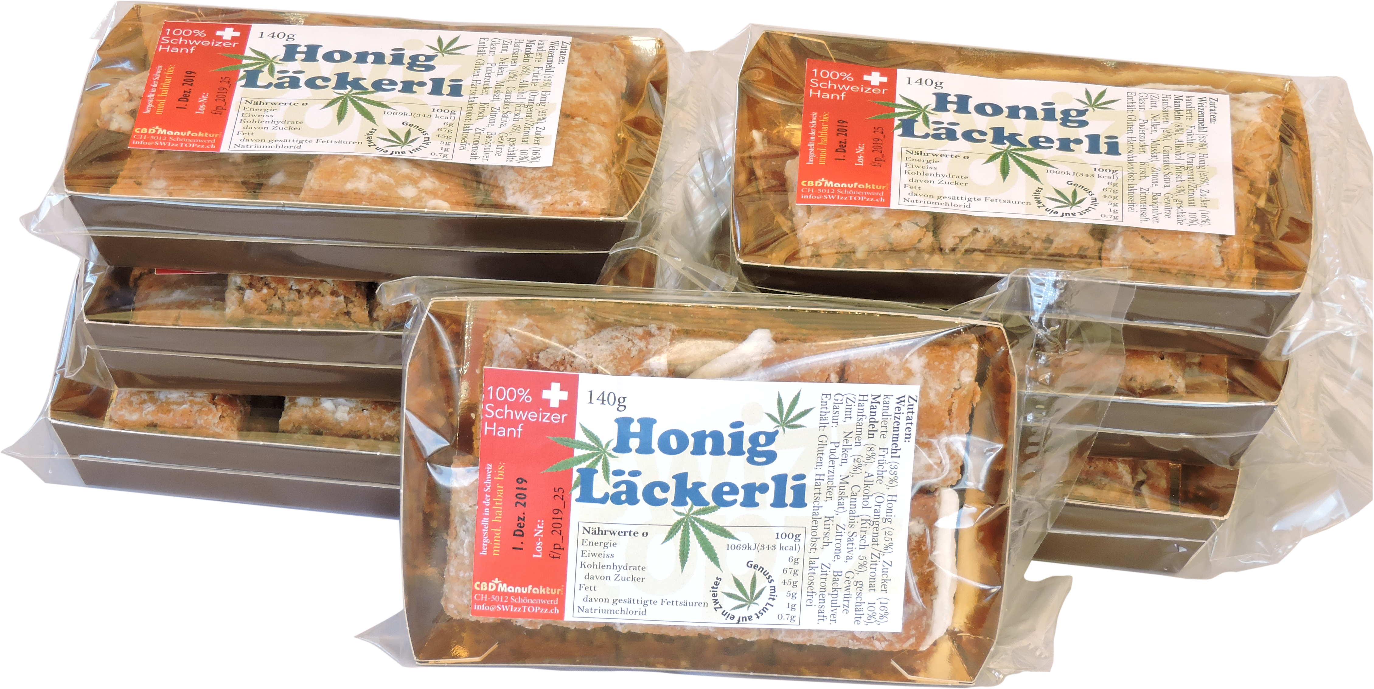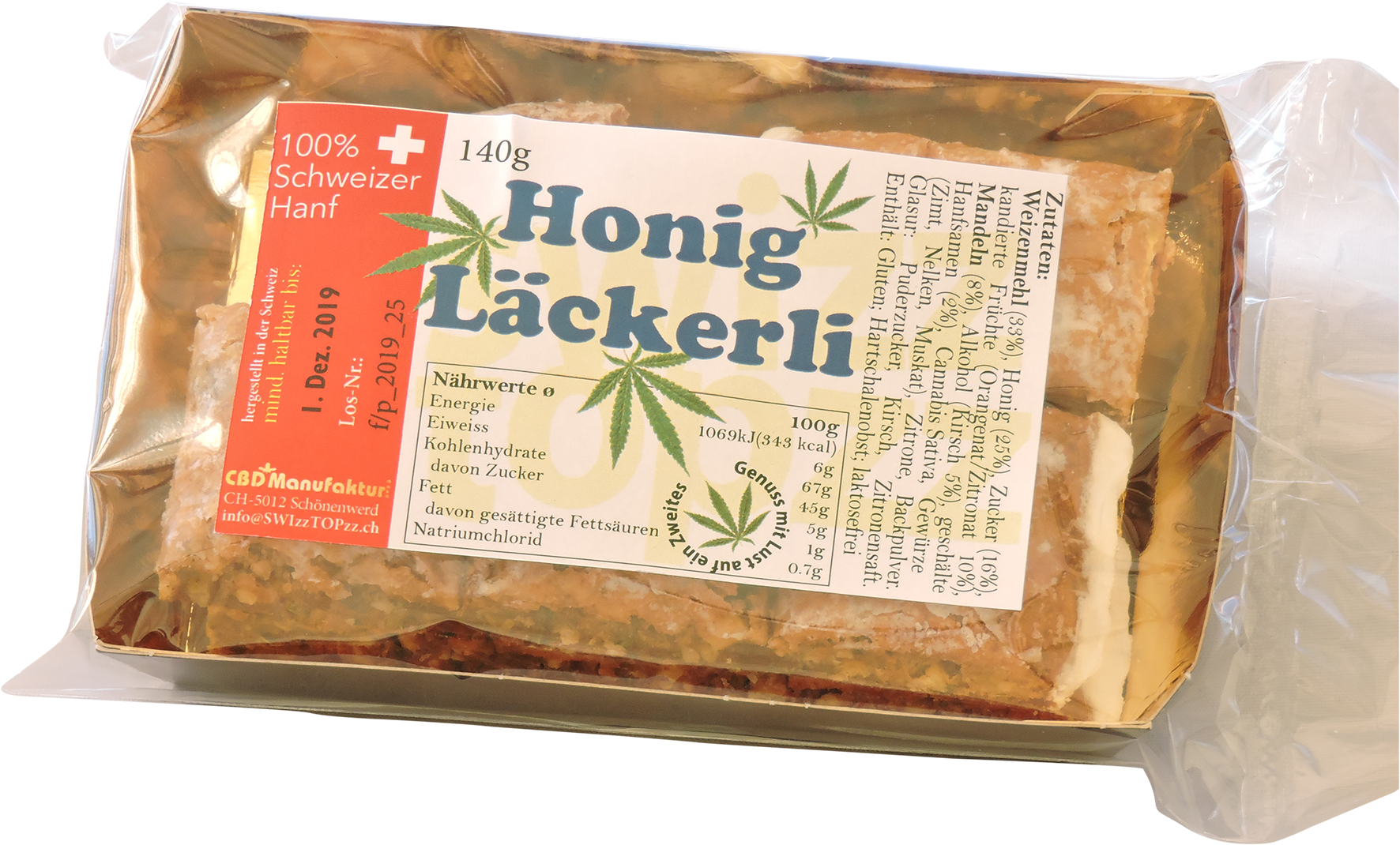 Nach traditionellem Schweizer Rezept mit geschälten Hanfsamen und Blätter vom Hanfkraut. Nur feinste auserwählte Zutaten verarbeitet zu einem süss-hanfigen Gschmackserlebnis. 100% legal!Für unsere Backzutat bearbeiten wir das Hanfkraut extra - wie das Entfernen unerwünschte Bitterstoffe und Verunrei ...Weiterlesen